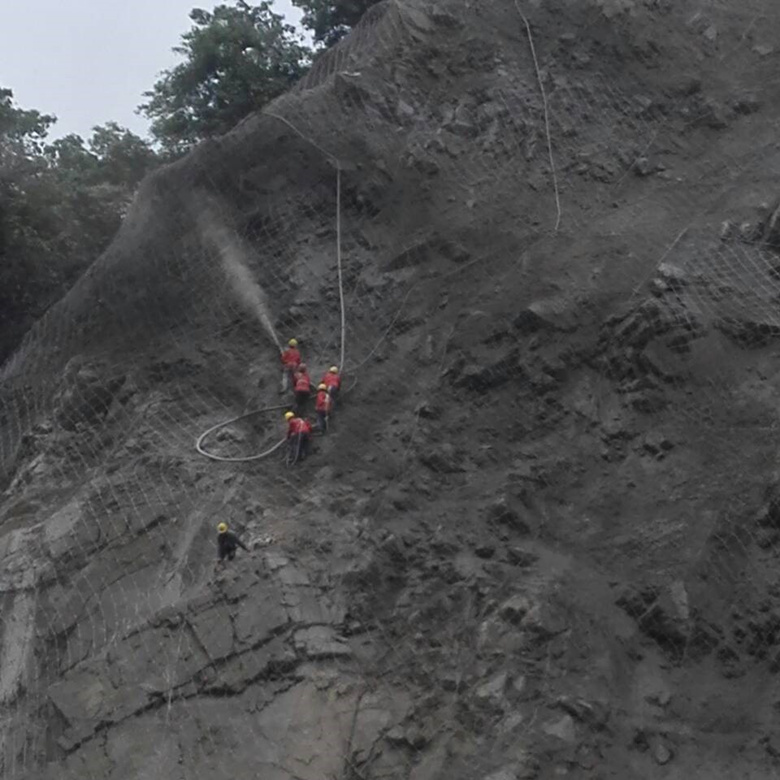 項目組臨危不亂,發揮專業所長,迅速確定了滑坡應急搶險實施方案:坡面清危+隨機錨桿淺層錨固+巖縫、凹槽注漿加固+表層淋漿硬化+GPS-2主動防護網防護+C20細石混凝土噴射,方案得到了現場專家組及相關單位的一致認同。搶險現場立刻成立了技術組、交通協調組、主動防護網安裝組、混凝土噴射組、材料二次搬運組、后勤組等小組,各司其職,各履其責,緊急而有條不紊地按搶險方案開始施工。