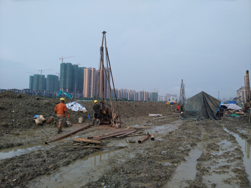 該項目巖土工程勘察原計劃工期為20個日歷天,勘探鉆孔782個、鉆探工作量17118米。開工初期,雖然調(diào)集了30臺鉆機進場,但要滿足建設(shè)單位的工期要求,仍存在很大差距,加之連續(xù)下雨導致場地積水嚴重且泥濘不堪,勘探進度十分緩慢,我院水文地質(zhì)工程公司迅速組織安排專人聯(lián)系成都、重慶、成都周邊地區(qū)的數(shù)十支鉆探隊伍,鉆機增至50臺。